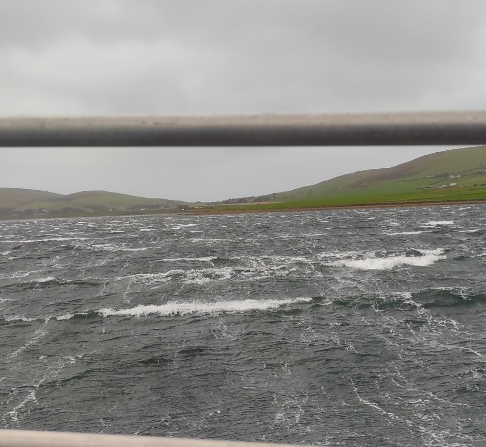 Die Bucht verlassen wollten wir ungern, da die Tidenströmung zwischen den Inseln in Kombination mit dem stürmischen Wind eine ernste Gefahr darstellt. Ins nicht allzuweit entfernte Kirkwall hätten wir es vermutlich geschafft, aber Hafenmanöver fahren bei 55 Knoten Wind? Illusorisch. Höchstens im Notfall, wenn Schäden am Material in den Hintergrund rücken.