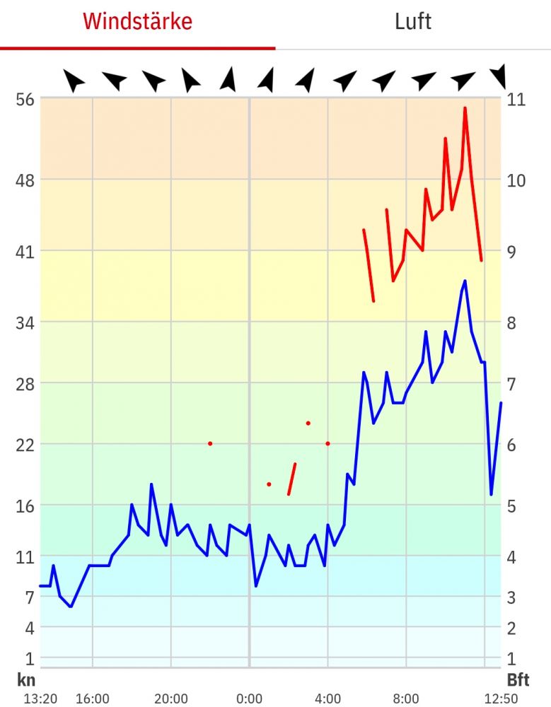 Die zwei in dieser Zeit durchgezogenen eher schwachen Stürme kamen aus einer für uns vorteilhaften Richtung und bewirkten bis auf ein paar Stunden verlorenen Schlafs nichts Nennenswertes.