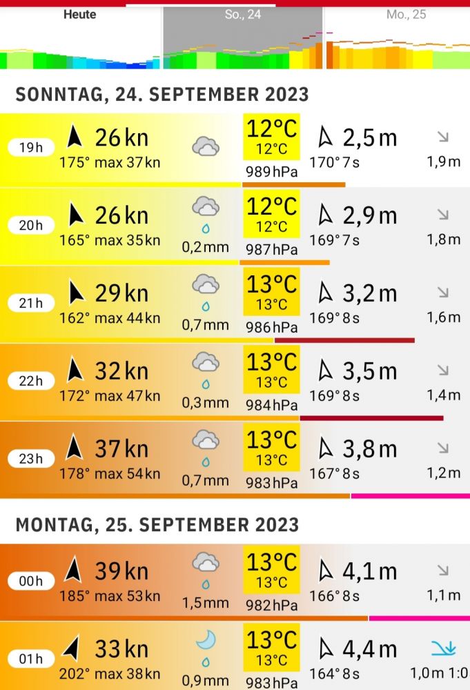 Immerhin dürfte sich der Kern des Geschehens um den Zeitpunkt des Niedrigwassers herum abspielen, das reduziert den Schwell im Hafen. Man freut sich über jeden Strohhalm. 😬