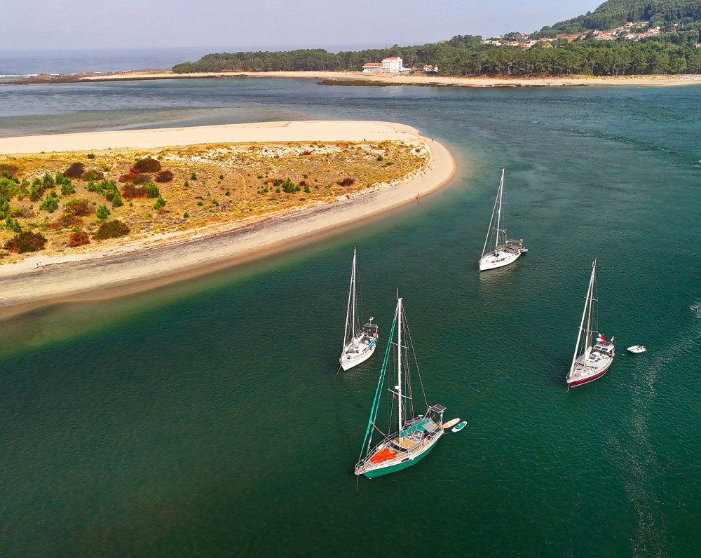 Um den Propeller genauer unter die Lupe zu nehmen, brauchen wir entweder einen Kran oder eine Sandbank. Letzteres findet sich noch im Ria Miño – sozusagen direkt vor unserer Haustür. Die lokale Polizeistation hat direkten Blick auf die besagte Position, und so holen wir uns die ausdrückliche Genehmigung (die unverzüglich, im besten Englisch und sehr höflich erteilt wird), bevor wir Müggele auf Grund setzen.